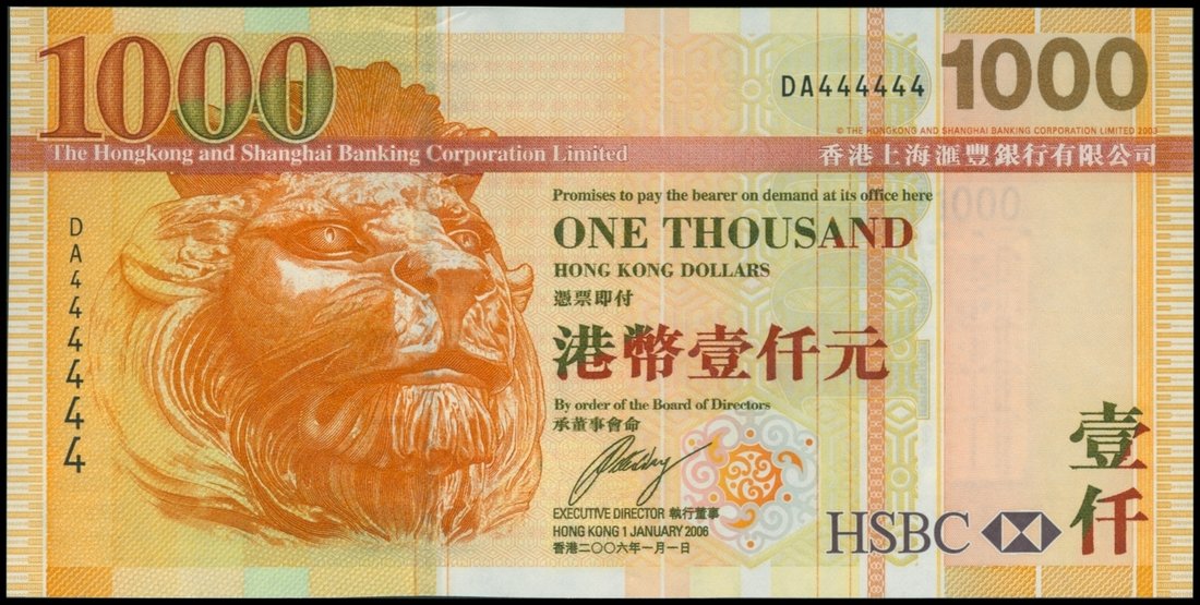 The HongKong and Shanghai Banking Corporation, $1000, 1.1.2006, solid serial number DA444444, yellow-orange and multicoloured, profile of a lion at left, view of Victoria Harbour on reverse, the watermark shows the HSBC building,