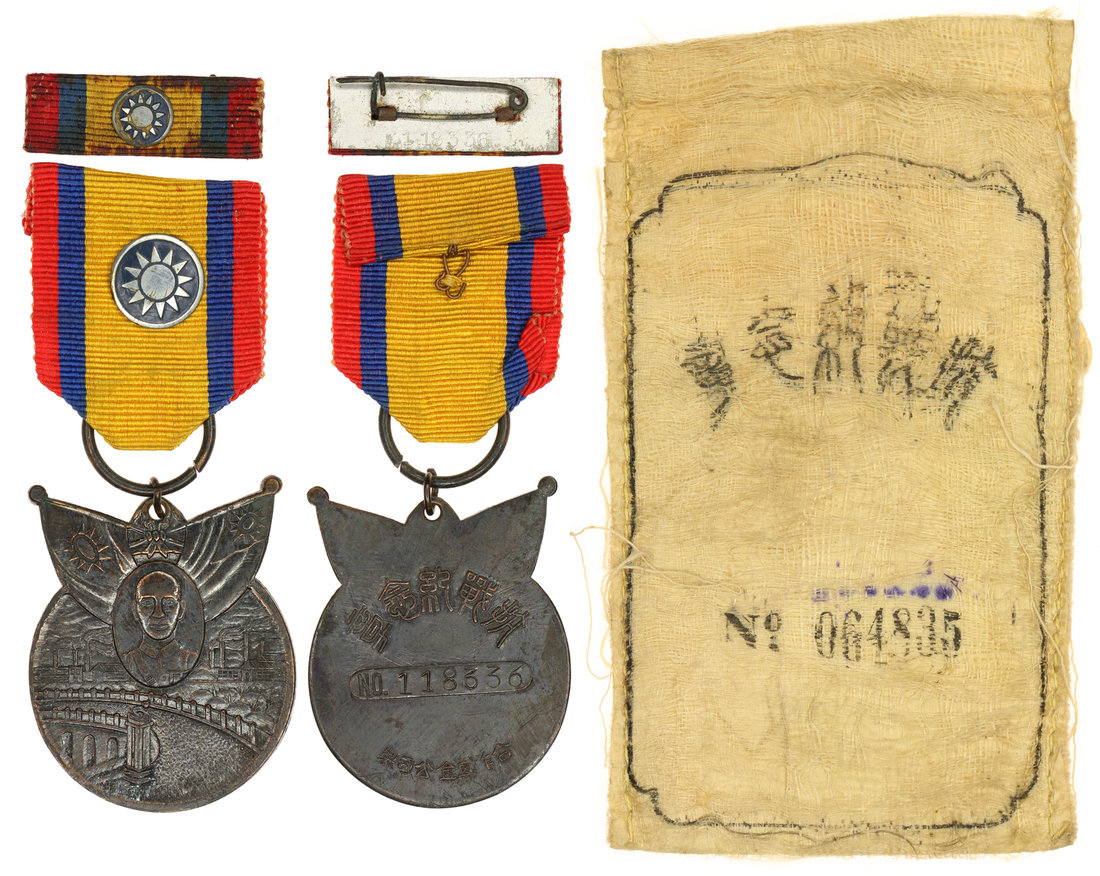 Republican Medal, a bronze medal issued for the commemorative of the war against Japanese invasion, number 118336, Chiang Kai Shek at top centre, flags at top left and right, with ribbon and badge,