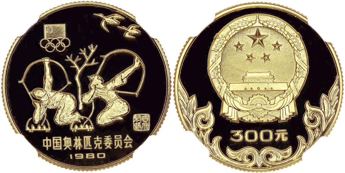 People's Republic of China, gold 300 yuan, 1980, 'Archery', issued for the Moscow Olympics,