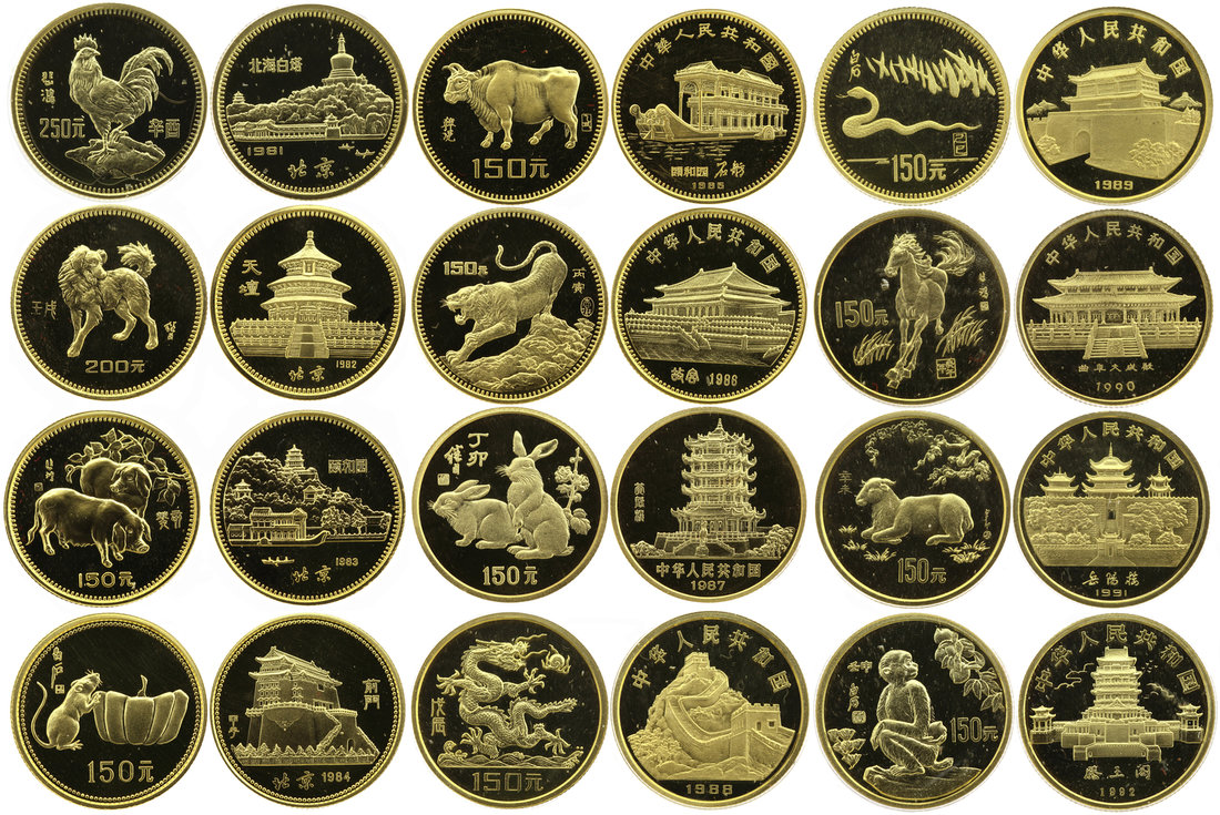 China, complete set of 12 gold Lunar Horoscope proof coins, 1981-1992, the first one 250 yuan, second 200 yuan, others 150 yuan, weight 8g 22K gold,