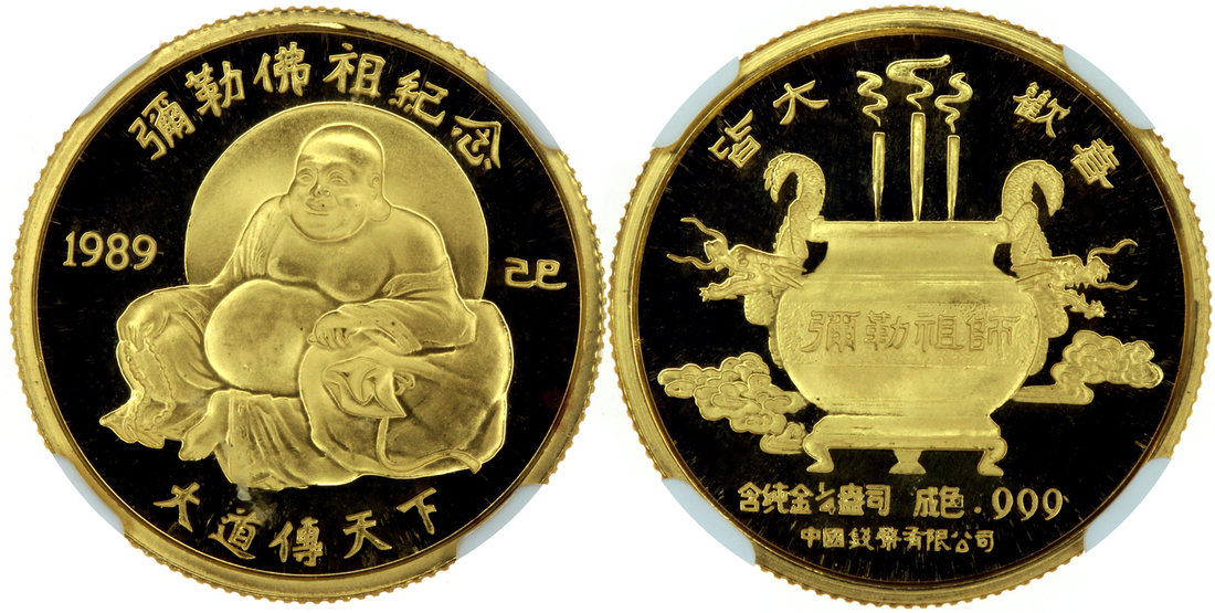 China, 1/4 oz gold medal, 1989, Maitreya Buddha, NGC PF69UC