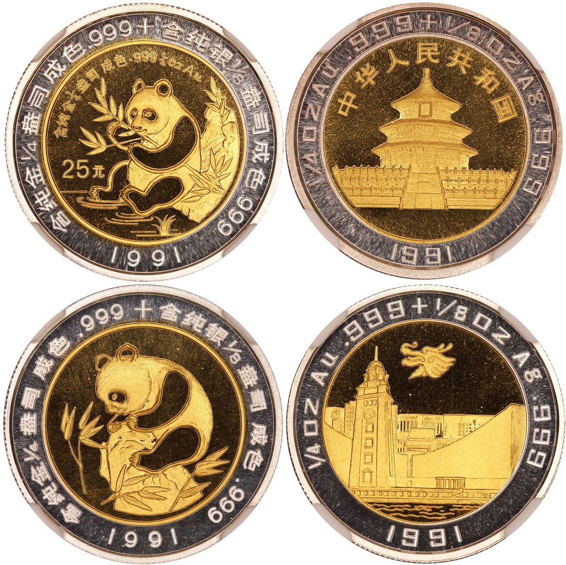 People's Republic of China, a pair of bimetallic gold and silver pandas, 1991, the first one with a denomination of 25 yuan and the other a panda medal issued for the Hong Kong Exposition, a limited issue of 1500 sets,