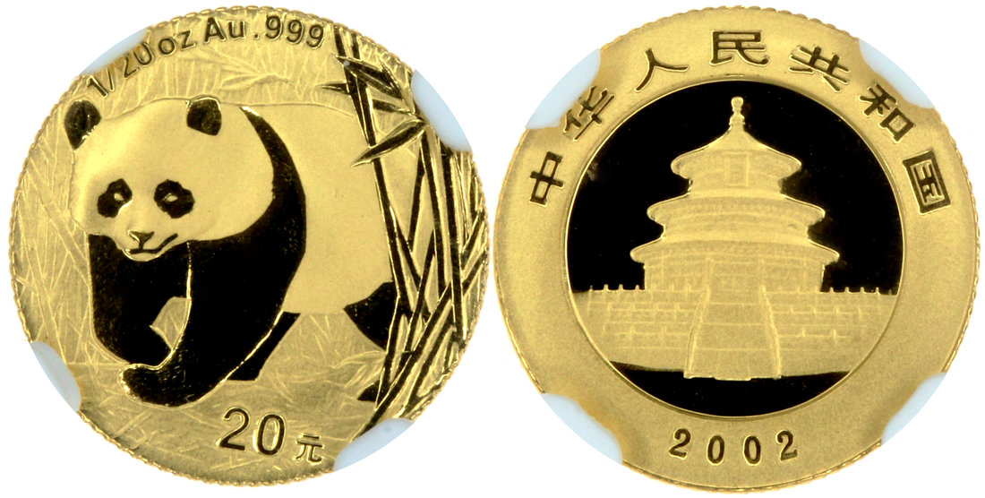 China, 20 Yuan, 1/20 oz gold coin, 2002, Panda Series, NGC MS70