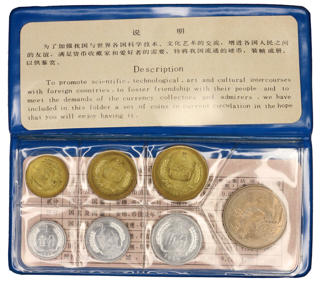 People’s Bank of China, set of 7 ‘Great Wall’ coins, 1980, 1, 2, 5 fen and 1, 2, 5 jiao and 1 yuan, uncirculated, housed within a blue plastic folder,