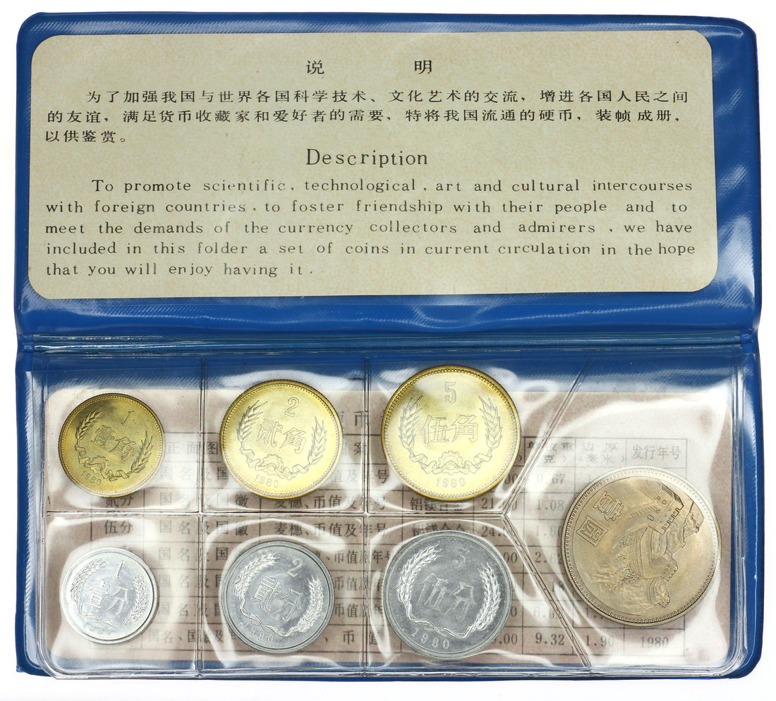 People’s Bank of China, set of 7 ‘Great Wall’ coins, 1980, 1, 2, 5 fen and 1, 2, 5 jiao and 1 yuan, uncirculated, housed within a blue plastic folder,
