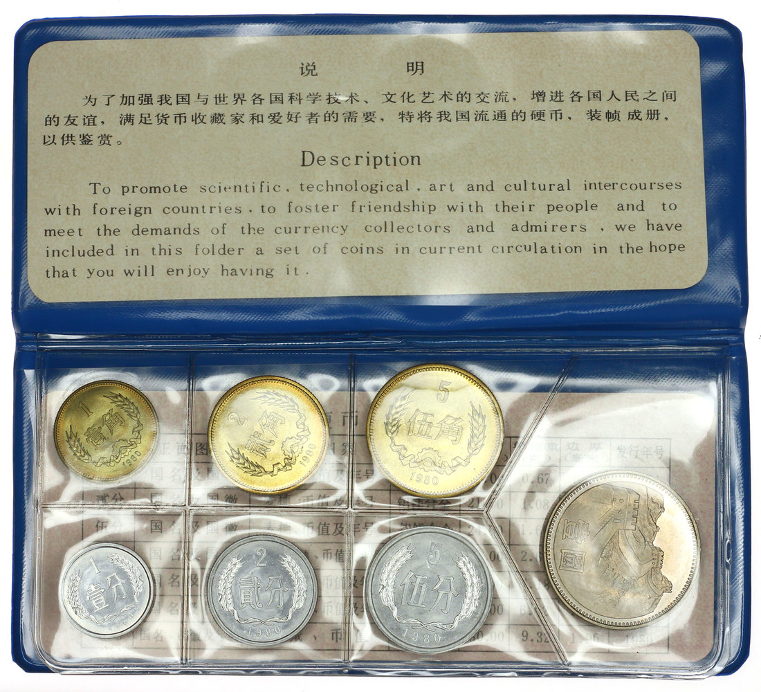 People’s Bank of China, set of 7 ‘Great Wall’ coins, 1980, 1, 2, 5 fen and 1, 2, 5 jiao and 1 yuan, uncirculated, housed within a blue plastic folder,