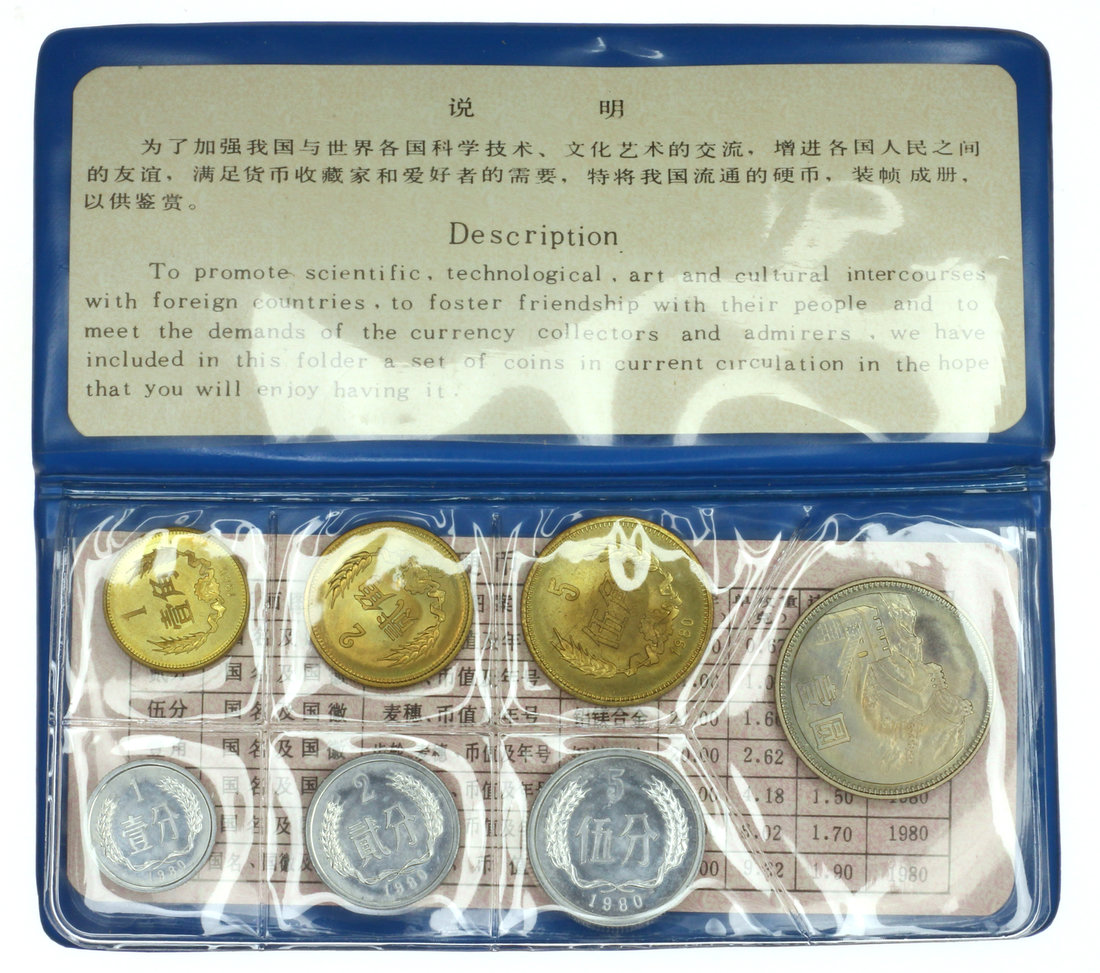 People's Bank of China, circulating coin set of 1980, including 1, 2, 5 fen, 1, 2, 5 jiao and 1 yuan,