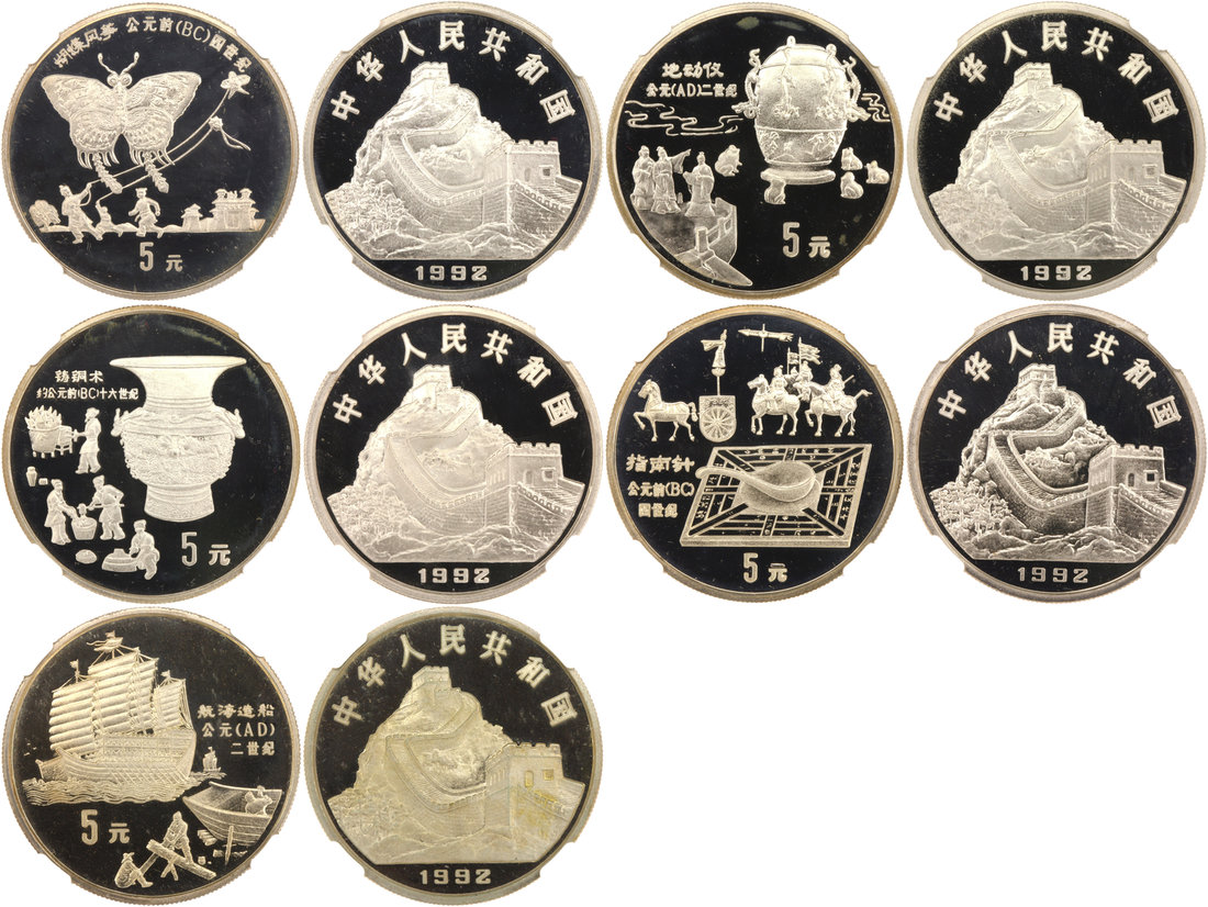 China, 5 Yuan, 44g silver PIEDFORT proof set of 5, 1992, Inventions & Discoveries Series, Ancient Shipbuilding and Bronze Age Urn NGC PF69UC; Seismograph, Compass and Kite Flying NGC PF67UC (5)