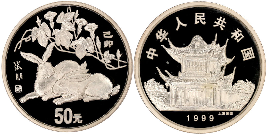 China, silver 50 Yuan, 5 oz. silver coin, 1999, Lunar Series, Year of the Rabbit, 5 oz pure silver, mintage of 1000, PCGS PR67DCAM.