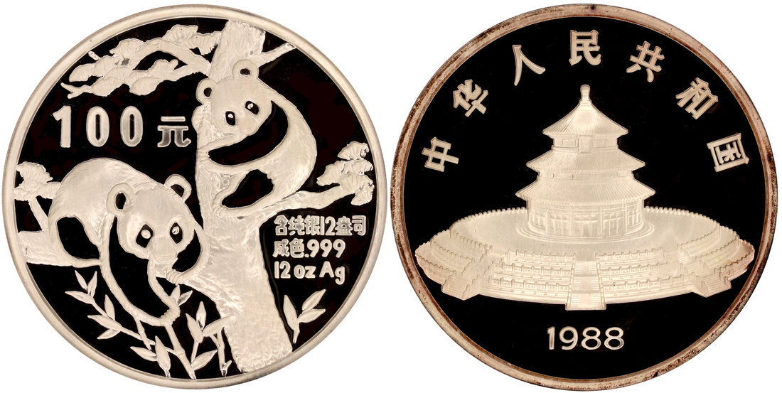 China, silver 100 Yuan, 12 oz silver, 1988, Panda Series, 12 oz pure silver, mintage of 5000, NGC PF 67 Untra Cameo.