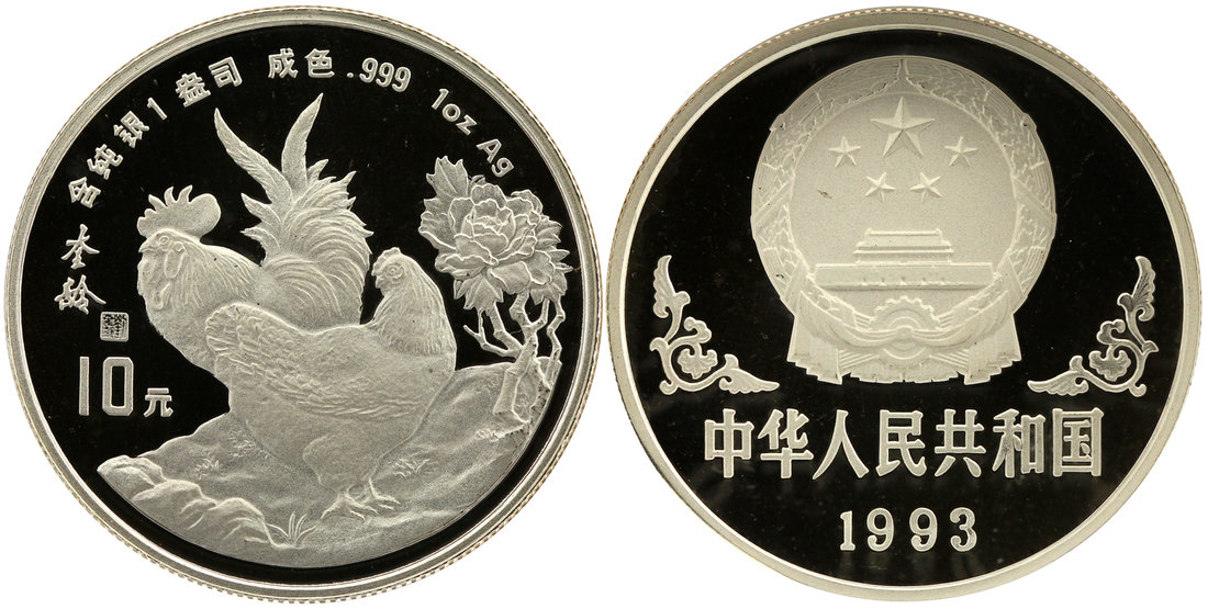 People's Republic of China, 10 yuan, silver Chinese horoscope coins (second series), 1993, Lunar Series, Year of the Rooster, come with original certificate of authenticity,
