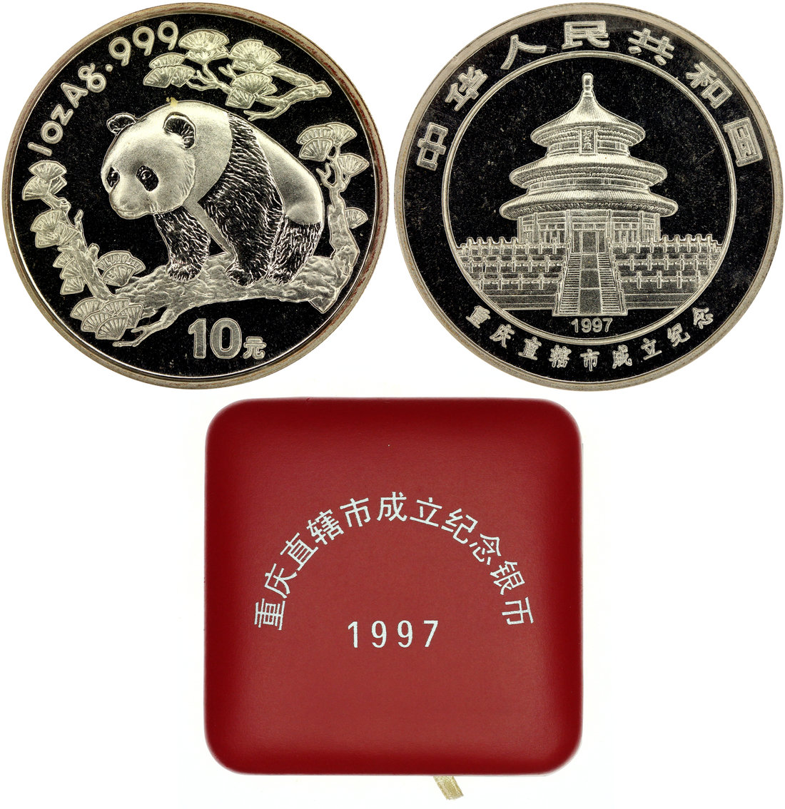 China, a silver Panda coin, 10 yuan, struck for Chongqing changed to the first level administrative subdivision in 1997, 1 oz silver,