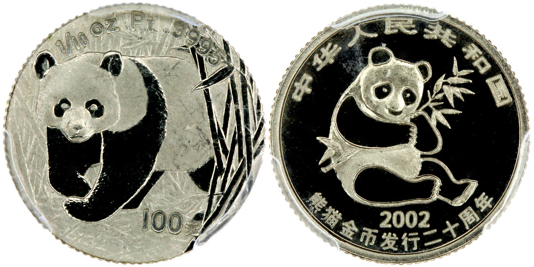 China, 100 Yuan, 1/10 oz platinum coin, 2002, Panda Series, PCGS PR67DCAM