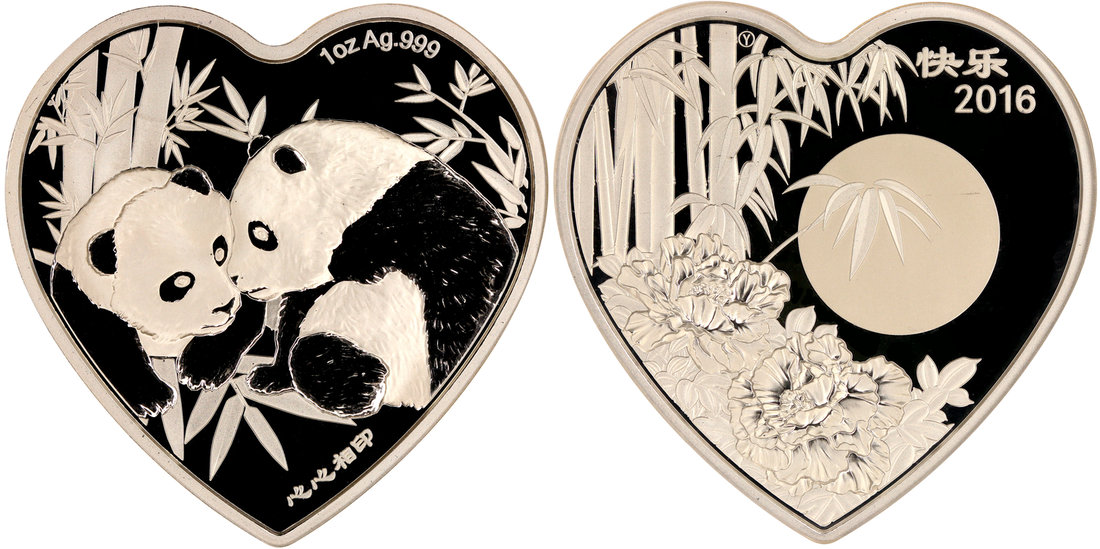 China, 1oz silver medal, 2016, Official Panda Issue, Valentine Banboo Panda Early Release, Heart Shaped. Including a copy of "Gold and Silver Panda Coin Buyer's guide" by Peter Anthony, which is the first comprehensive guide to Pandas. It provides unique insights, photos and useful information about the more than 450 charming - and often valuable - coins in this growing family. NGC PF69UC, Peter Anthony Signed Label