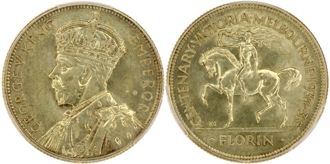 Australia, silver 1 florin, 1934-35, George V on obverse, man riding horse with torch on reverse,