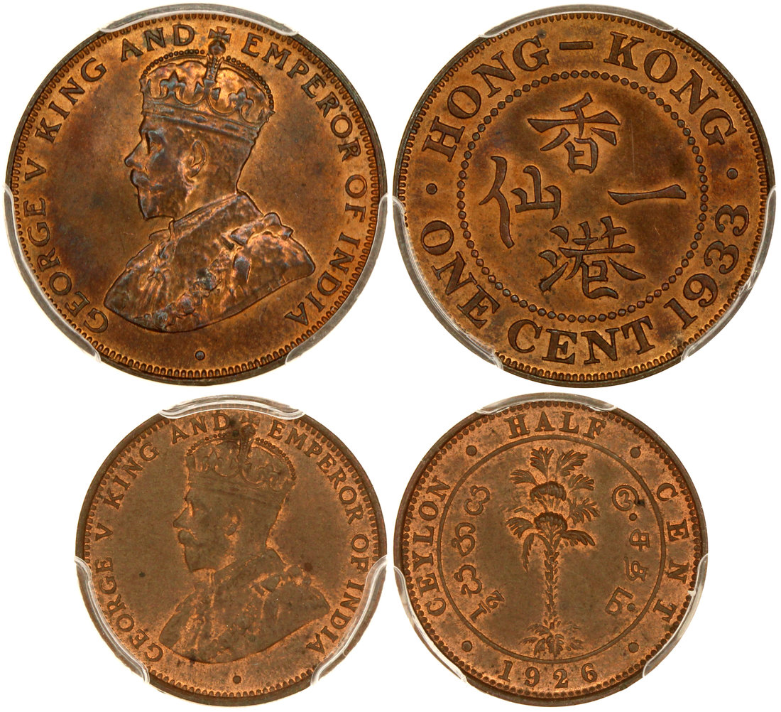 Mixed lot, a pair of bronze half cent and 1 cent, Ceylon, 1/2 cent, 1926 and Hong Kong, 1 cent, 1933 both George V on obverse,
