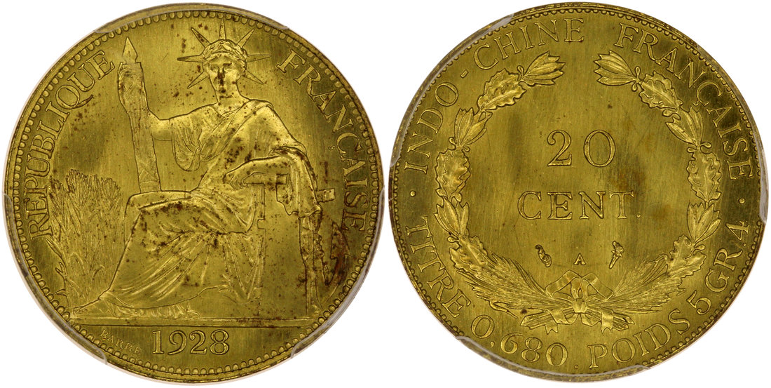 Indochina, 1928-A P20C, Brass Pattern (ESSAI) 20 Centimes, 1928, Brass / Special Strike, made for the 1928-A 20 Centimes Silver type, diameter 26mm. Ref. Gadoury Lec. 227 variety Brass, KM-E13.
