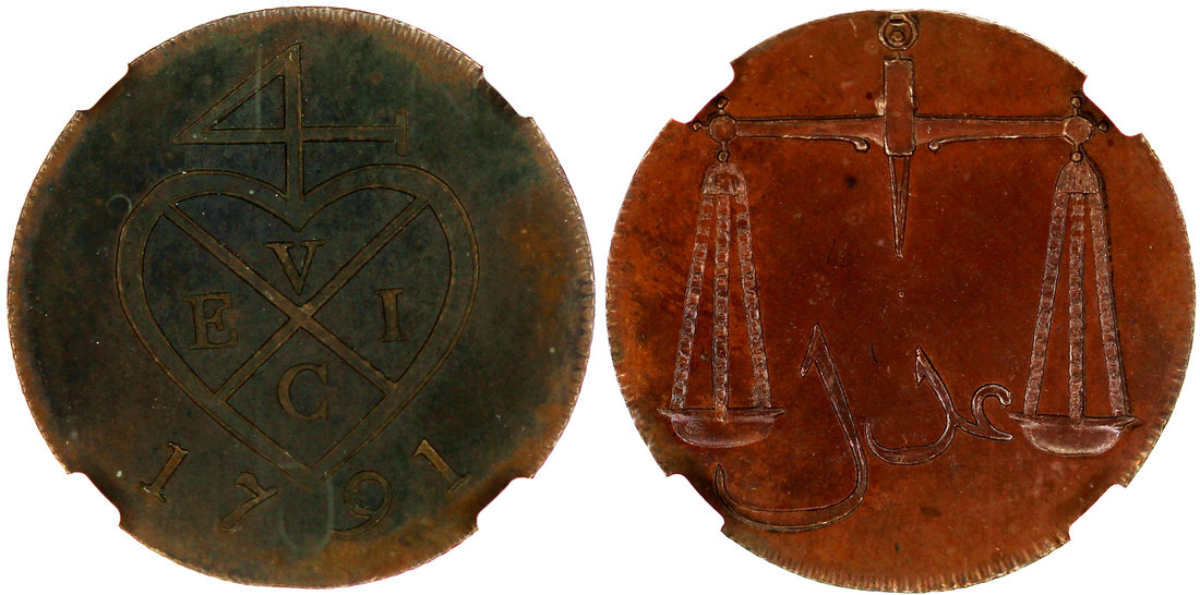 East India Company, Bombay Presidency, 1 pice, proof, 1791, company logo on obverse,