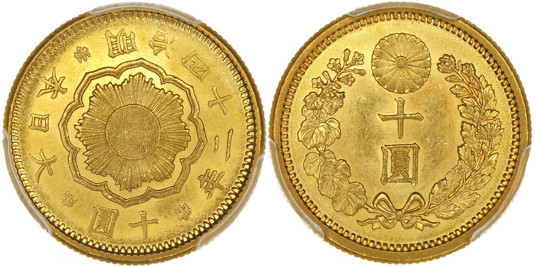 Japan, gold 10 yen, Meiji Year 42 (1909), value within wreath, the reverse shows the sacred mirror at centre, legend around border,
