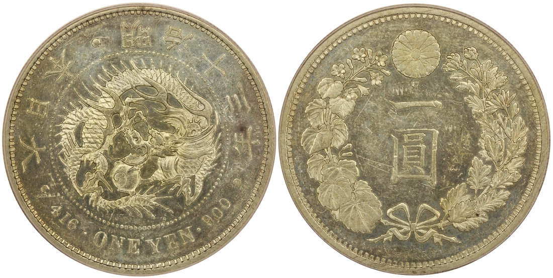 Japan, silver 1 yen, Meiji Year 13(1880), coiled dragon in circle on obverse,