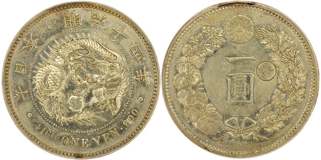 Japan, silver 1 yen, Meiji Year 14(1881), coiled dragon in circle on obverse, Chinese character 'yin' countermarked at right on reverse, low '4' variety,