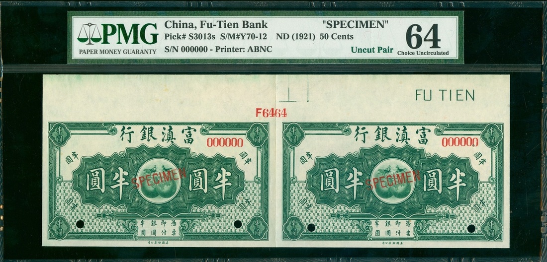 Fu Tien Bank, uncut specimen pair, 50 cents, 1921, serial number 000000, with archive number F6464,