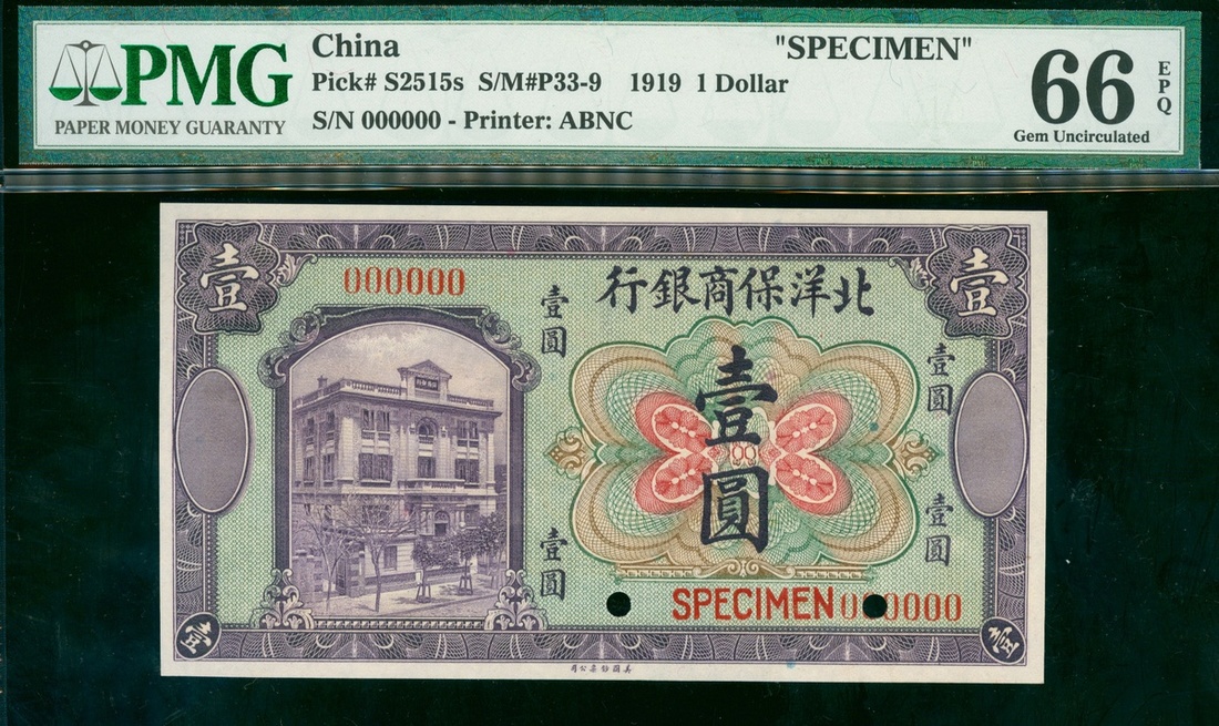 The Commercial Guarantee Bank of Chihli, $1, specimen, 1919, serial number 000000, (Pick S2515s), PMG 66EPQ Gem Uncirculated