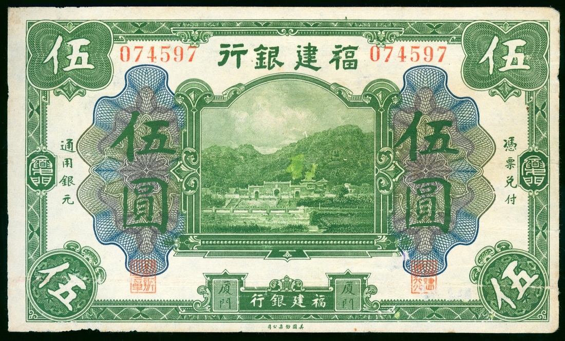 1915年褔建銀行5元,廈門地名,編號074597, AVF品相