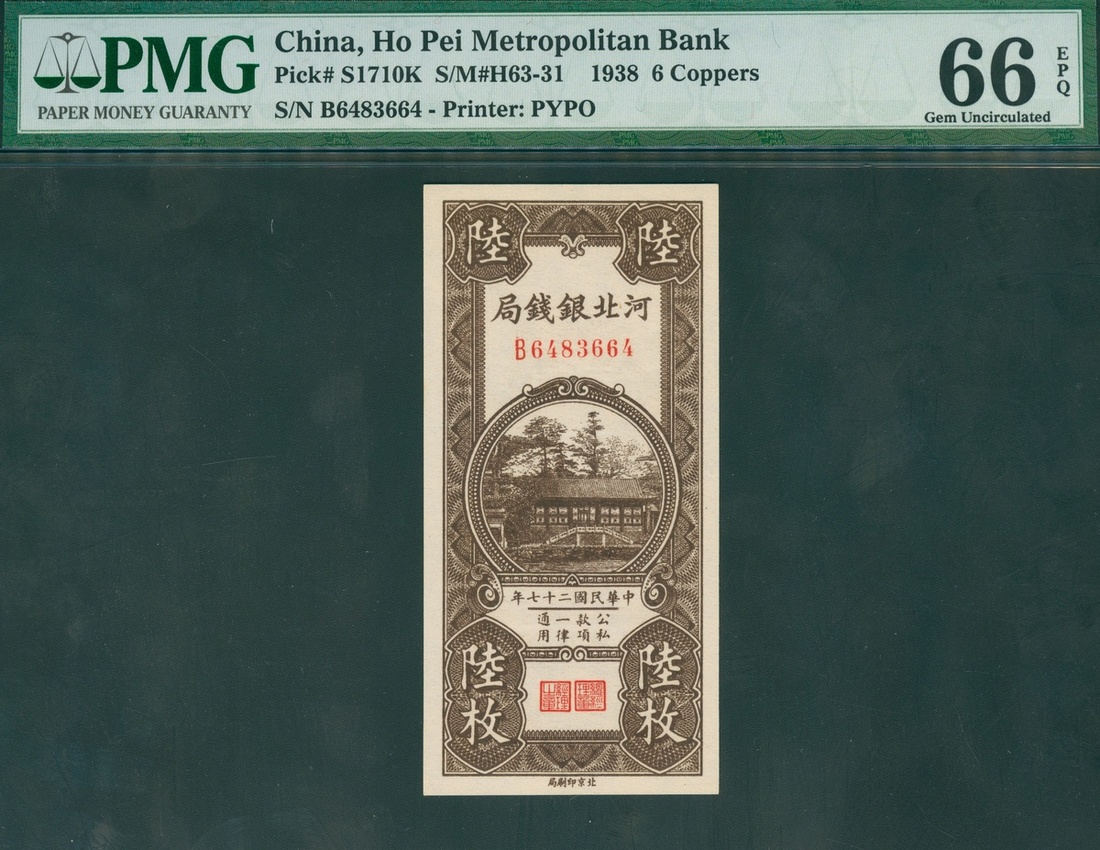 1938年河北銀錢局銅元6枚,編號B6483664,PMG66EPQ