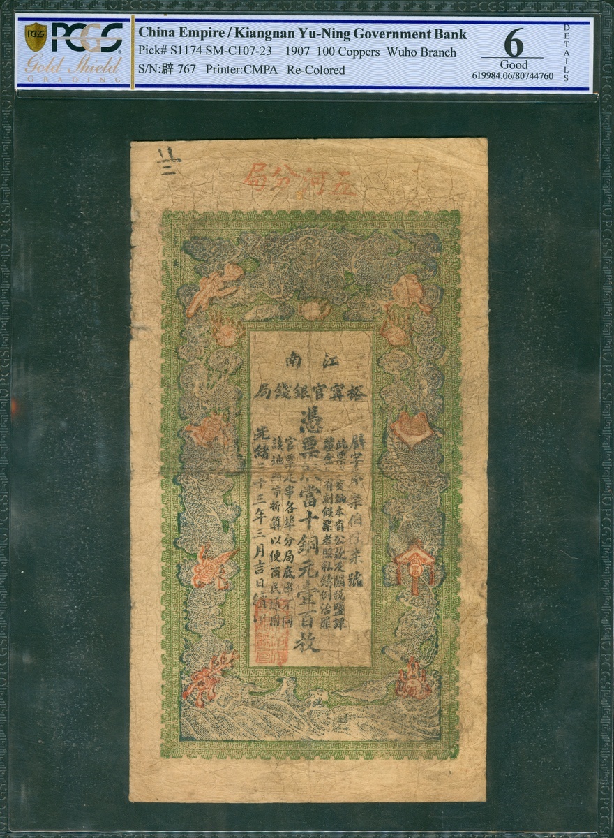 Kiangnan Yu-Ning Government Bank, 100 coppers, 1907, Wuho Branch, serial number 767, (Pick S1174), PCGSBG 6 Good (recoloured).