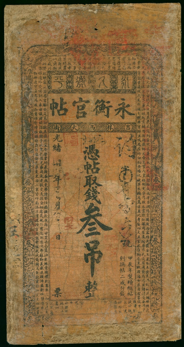 Kirin Yung Heng Provincial Bank, 3 tiao, Guangxu Year 34 (1908), vertical format, black and white, multiple red chops, reverse black, Chinese text,