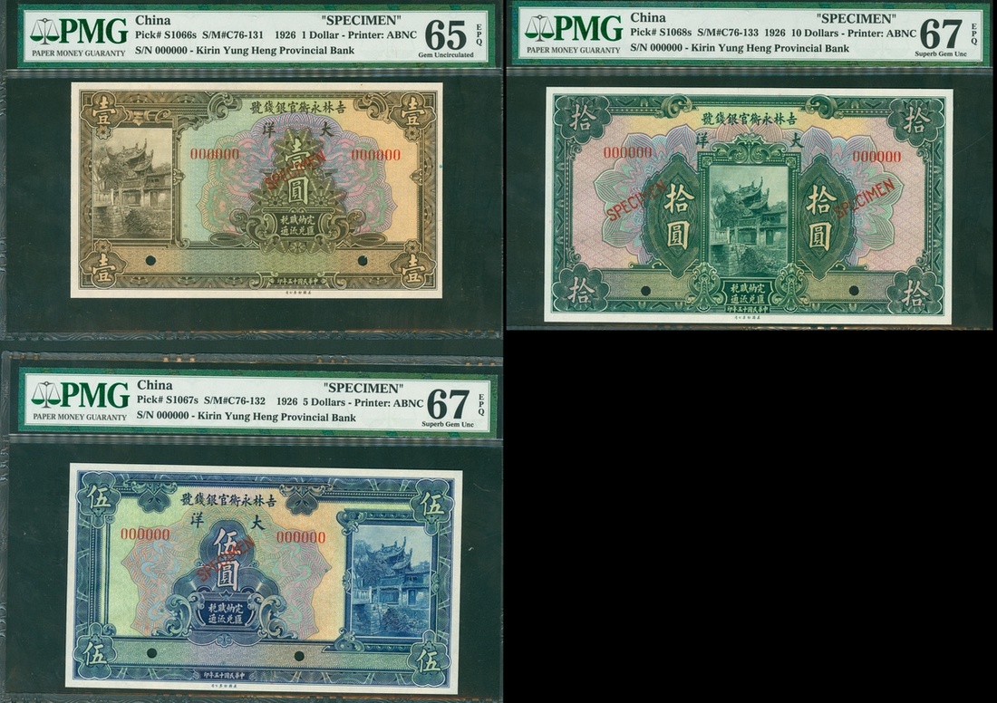 Kirin Yung Heng Provincial Bank, set of 3 specimens, $1, $5 and $10, series of 1926, (Pick S1066s to S1068s), graded PMG 65EPQ, 67EPQ and 67EPQ, a fantastic high grade set (3)