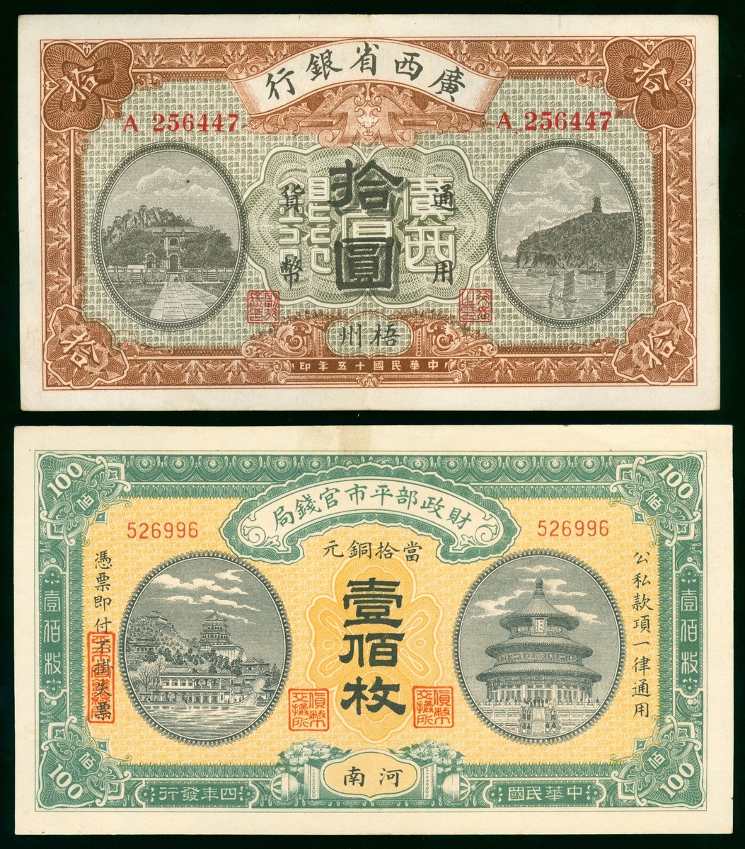 Mixed lot, The Provincial Bank of Kwangsi, 10 yuan, 1926, serial number A256447 and Market Stabilization Currency Bureau, Honan, 100 copper, 1915, serial number 526996,
