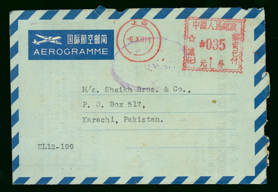 1971 Meter 35c air letter cover Shanghai to Pakistan with arriving c.d.s., some damage and soiling on the back.