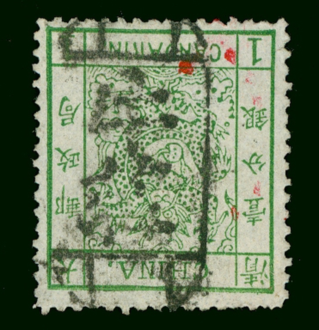 1 ca. green thick paper tied by full Newchwang seal cancelled, very fine and scarce. Chan7a