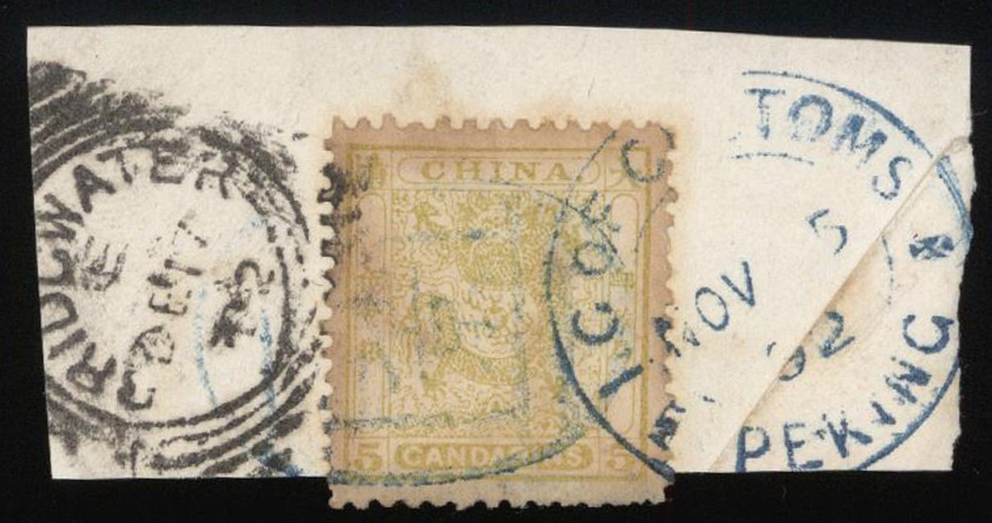 1892 Small Dragon 5 cds. on piece, with Peking seal cancellation , (5 Nov.) Peking I.G. Customs c.d.s.1 and (17 Dec.) England arrival c.d.s. .