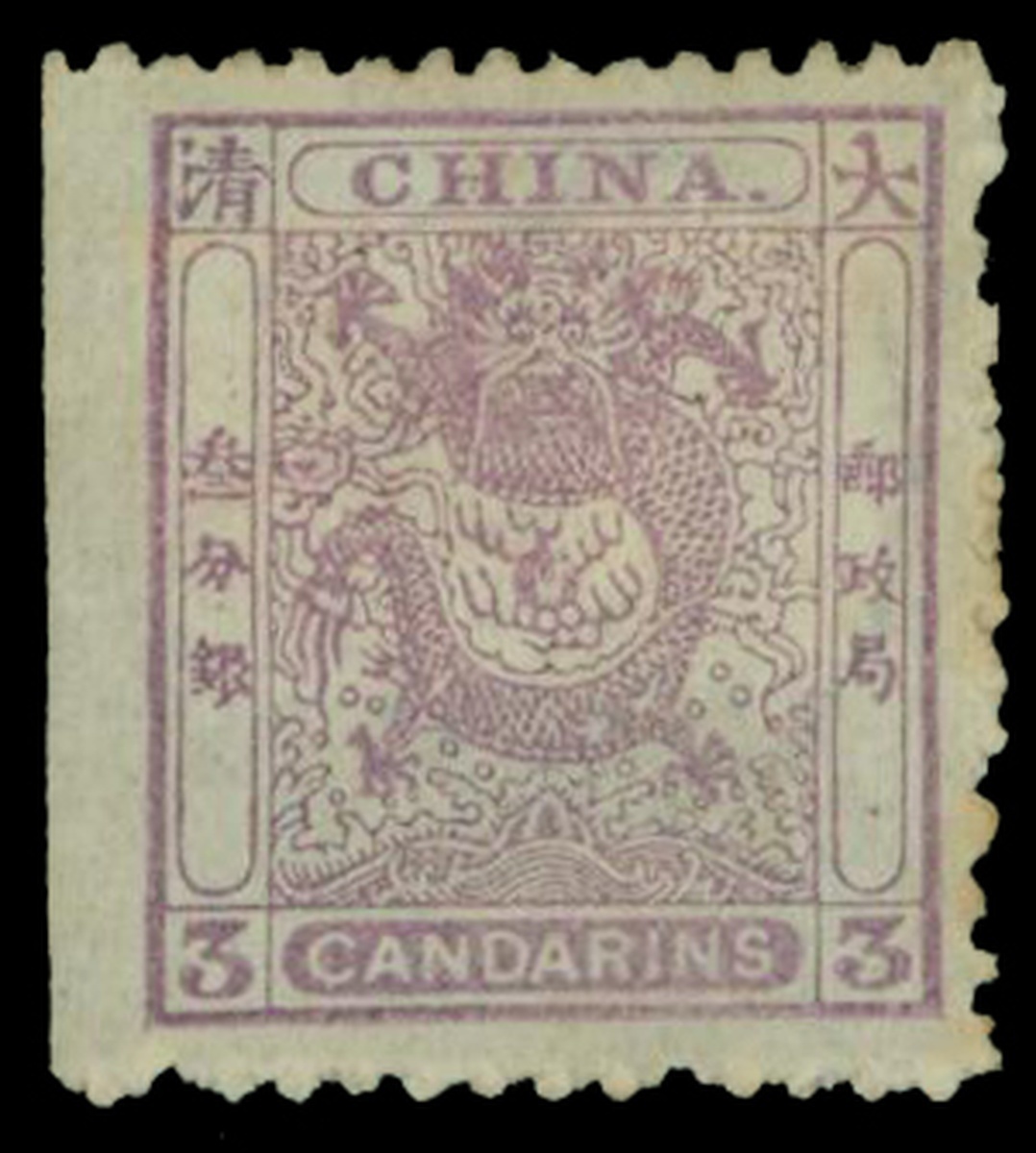 1885 3 cds Rough perforations, mauve, imperf. left margin, light mounted.