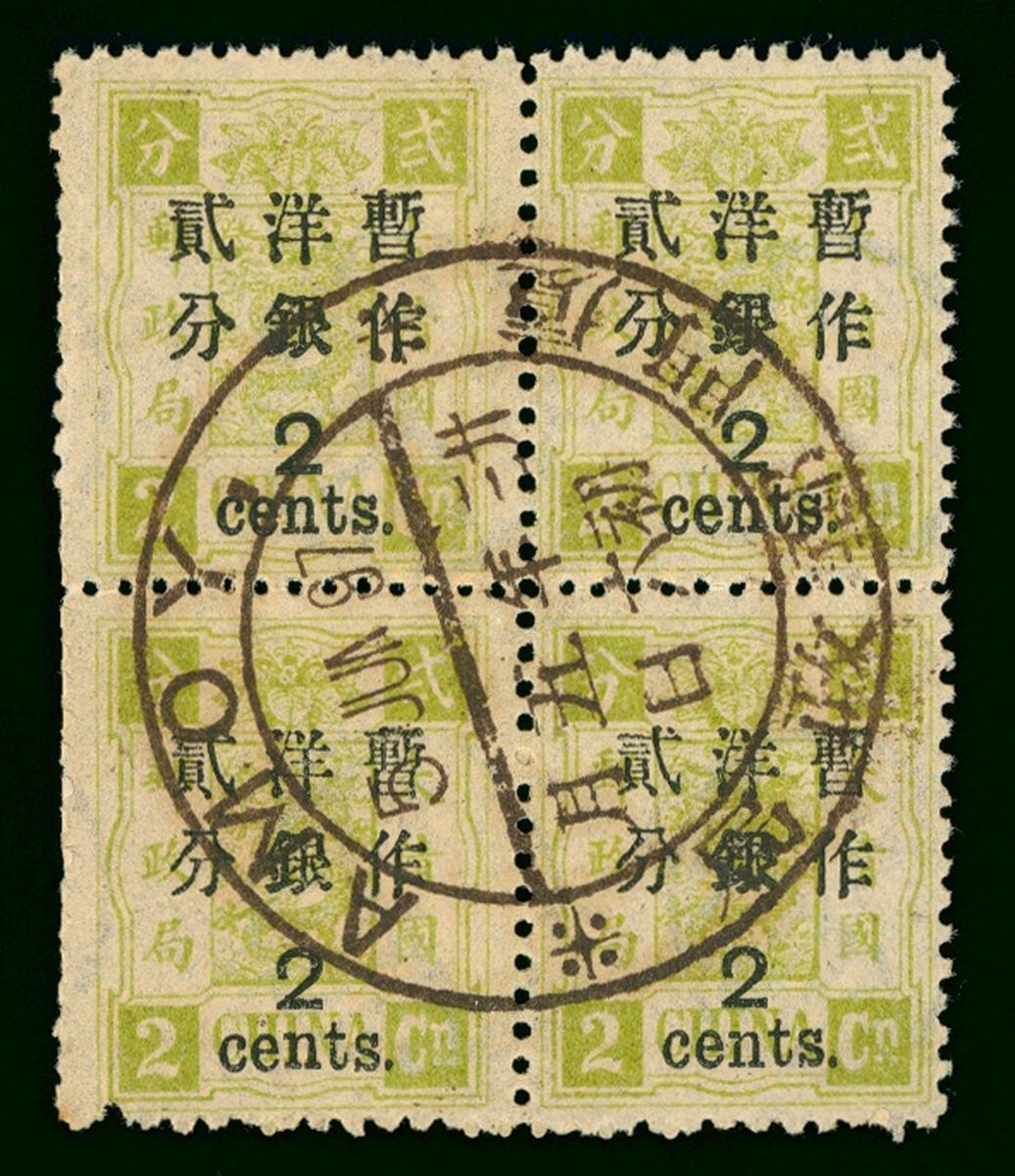 2 c. on 2ca. green, block of four, tied by full Amoy 5 Jun 97 dollar dater, earliest date usage of Amoy cancellation, very rare. Chan 39