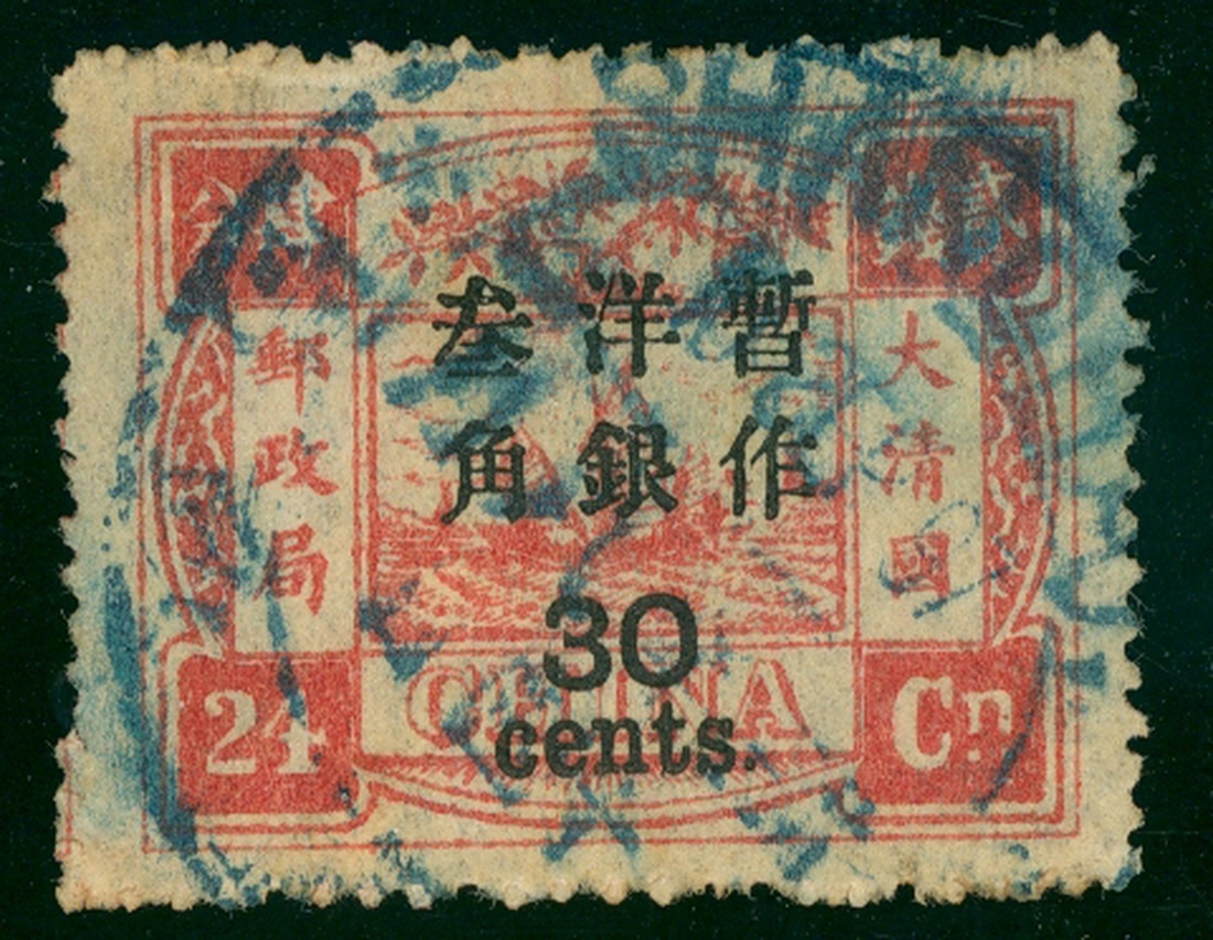 30 c on 24ca used with blue Shanghai dollar c.d.s. very fine. Chan 64.