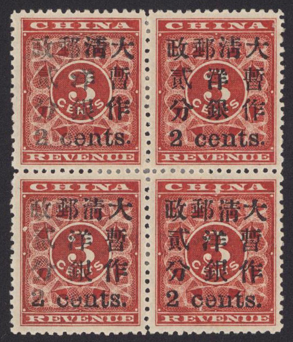 2c. on 3c. red, block of four, positions 1-2 / 11-12, mint with much original gum, very fresh colour. Chan 84