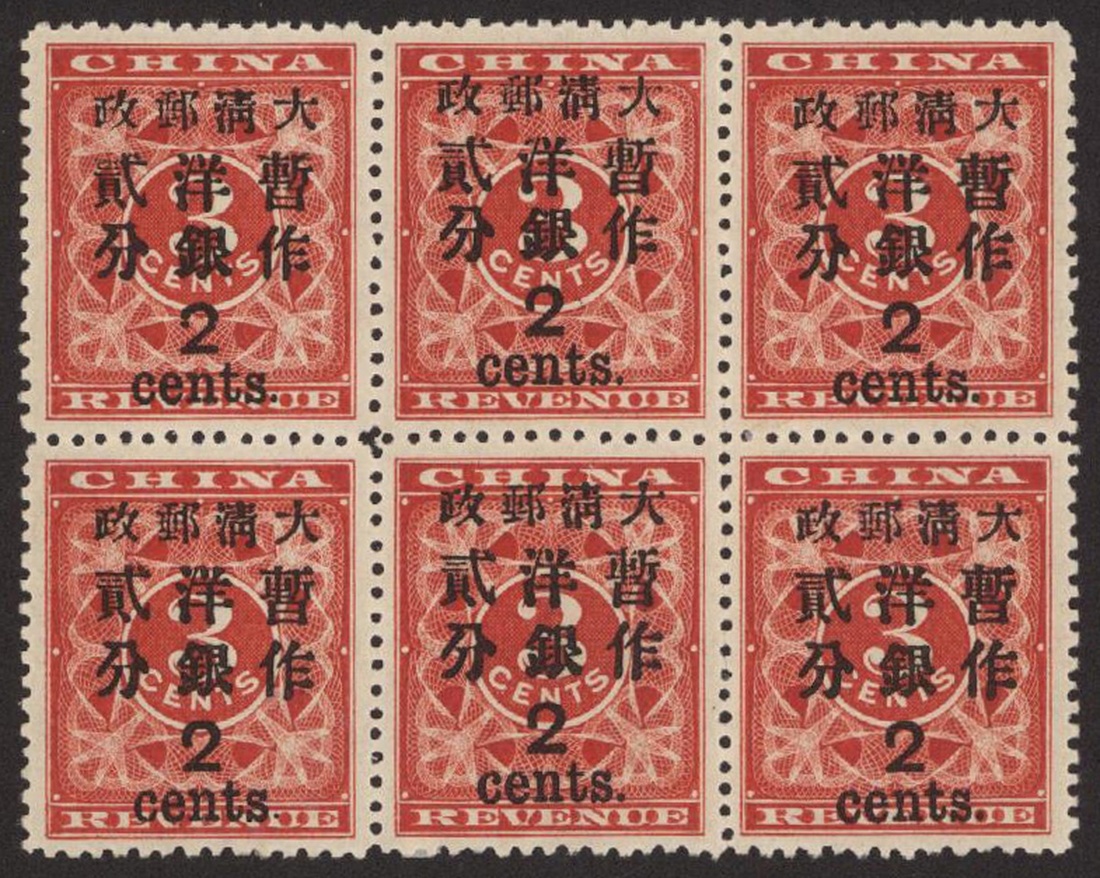 2c. on 3c. red, block of six, positions 14-15-11/19-20-16, middle row of pane showing raised surcharge 0.5mm, this distinctive raised surcharge variety of the fifth row occurs only on the lower two panes of the sheet, mint with full original gum and excellent centring, extremely fresh. Chan 88