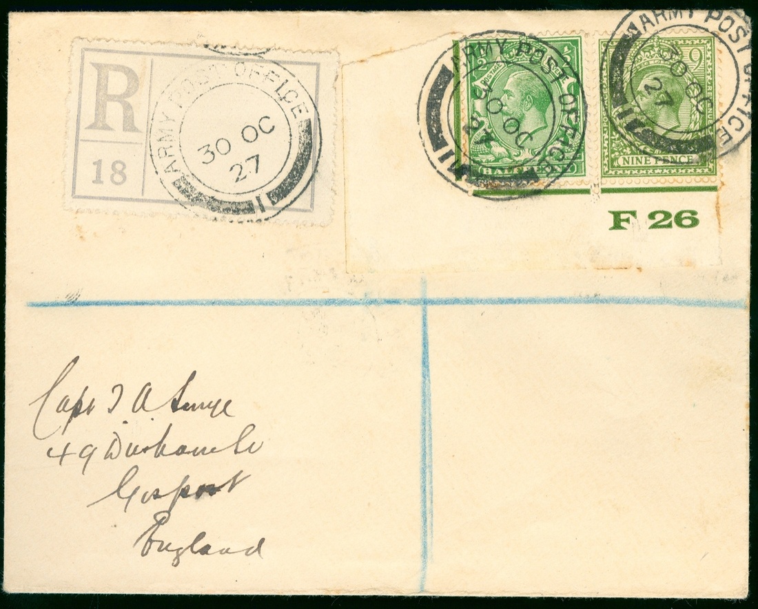 1927 (30 Oct.) a registered cover from Shanghai to England bearing 1/2p and 9p tied by Army Post Office, registered label alongside.