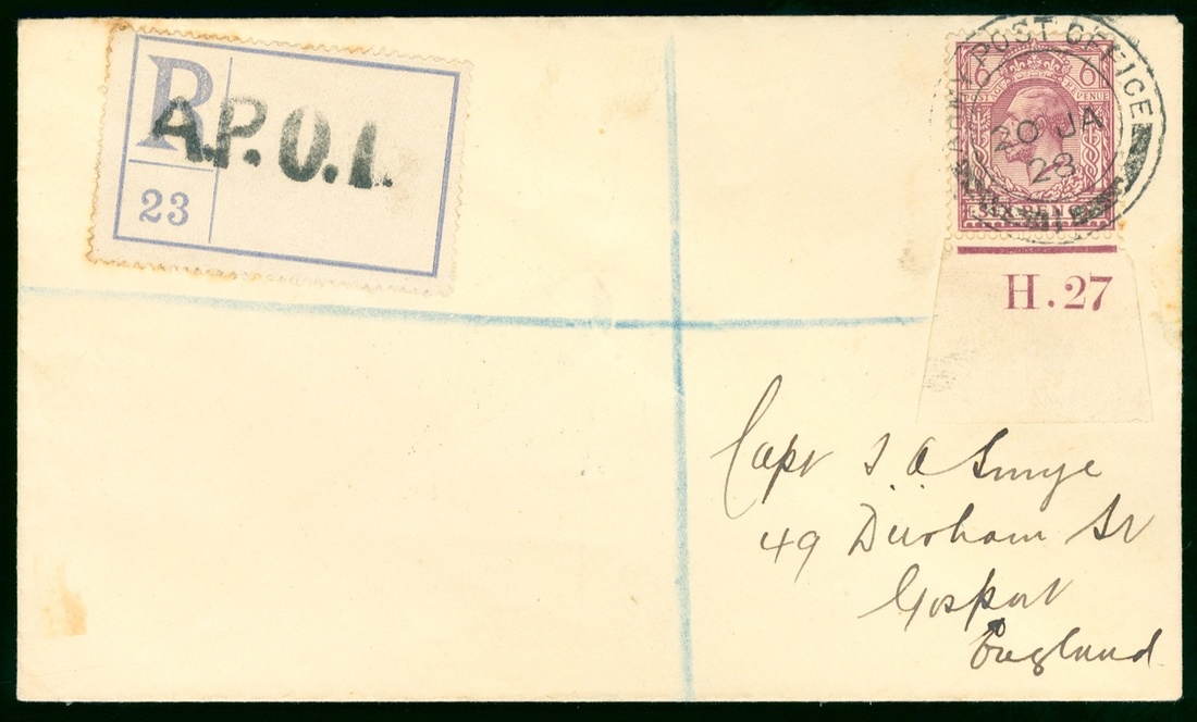 1928 (20 Jan.) a registered cover from Shanghai to England bearing KGV 6p tied by Army Post Office (1), A.P.O.1 registered label alongside.