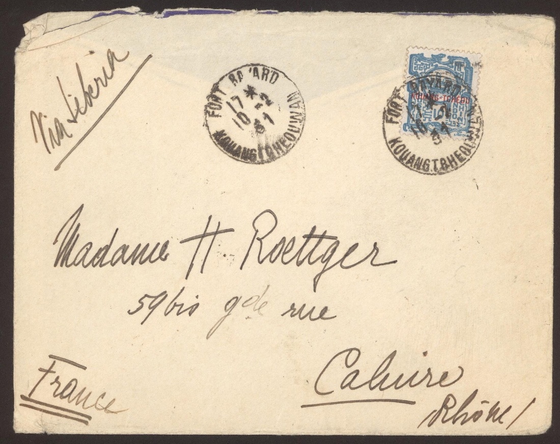 1931 (10 Feb.) a cover to France bearing 10c. overprinted ‘Kouang Tcheou’ tied by Fort Bayard Kouang.Tcheou.Wan c.d.s. via Hong Kong(4 Feb.).