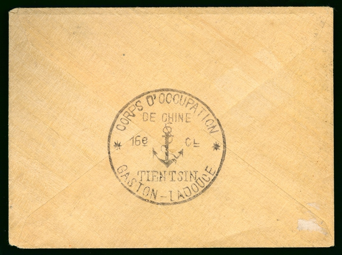1900s a cover from Tientsin to France bearing 1c. tied unclear c.d.s., reverse with CORPS O’OCCUPATION DE CHINE TIENTSIN military cancellation.