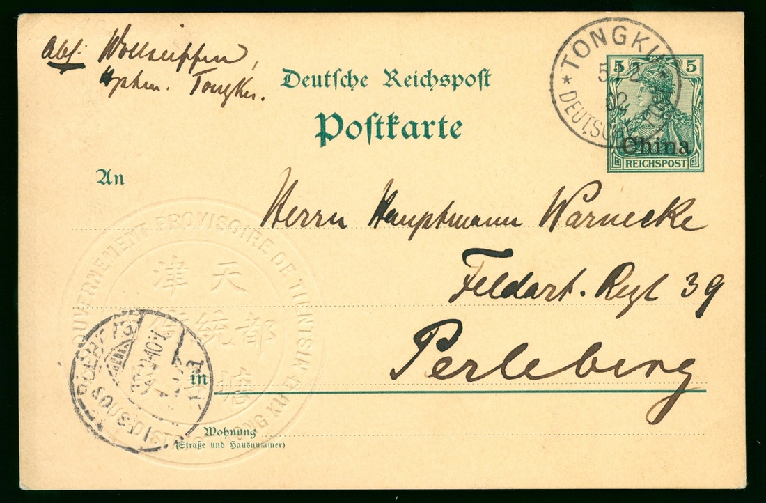 1902 (5 Feb.) overprinted China 5fp stationery card tied by Tongku c.d.s. to Germany.