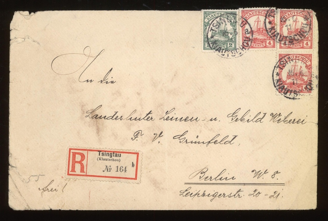 1911 (16 Jun.) a registered cover from Tsingtau to Germany, 14c. rate.