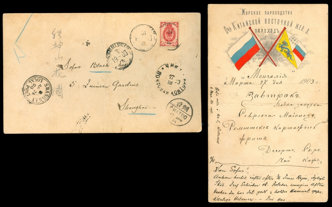 1903 (13 Apr.) a Russian menu postcard from Russia to Shanghai bearing 3k tied by unclear c.d.s. via Chefoo (17 Apr.), interesting item.