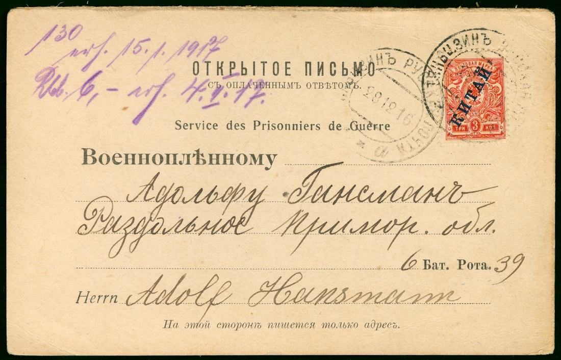 1916 (28 Dec.) a prisoners of WWI stationery 3k. overprinted ‘China', Tientsin used.