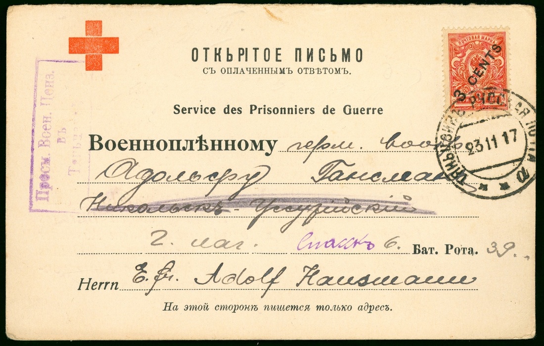 1917 (23 Nov.) a prisoners of WWI postcard bearing 3c. on 3k.,Tientsin used.